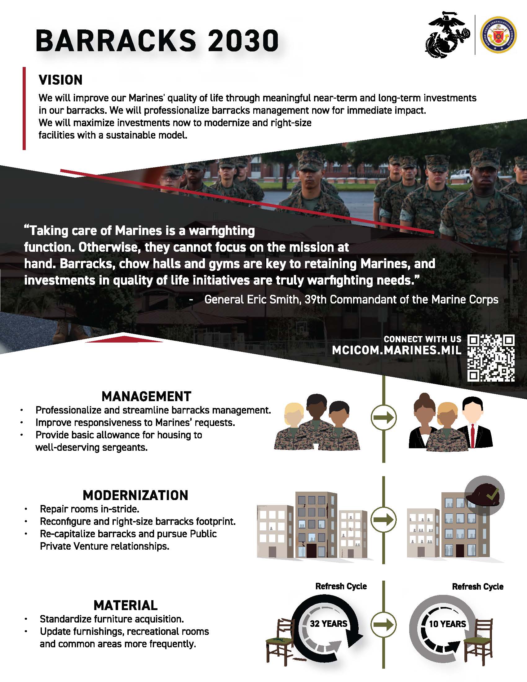 PENTAGON -- Effective immediately, Marine Corps Installations Command will conduct an environmental, health, and safety inspection of all Marine Corps barracks to ensure service compliance with its commitment to its residents to provide a safe, secure, clean, and consistent living standard across the unaccompanied housing enterprise.