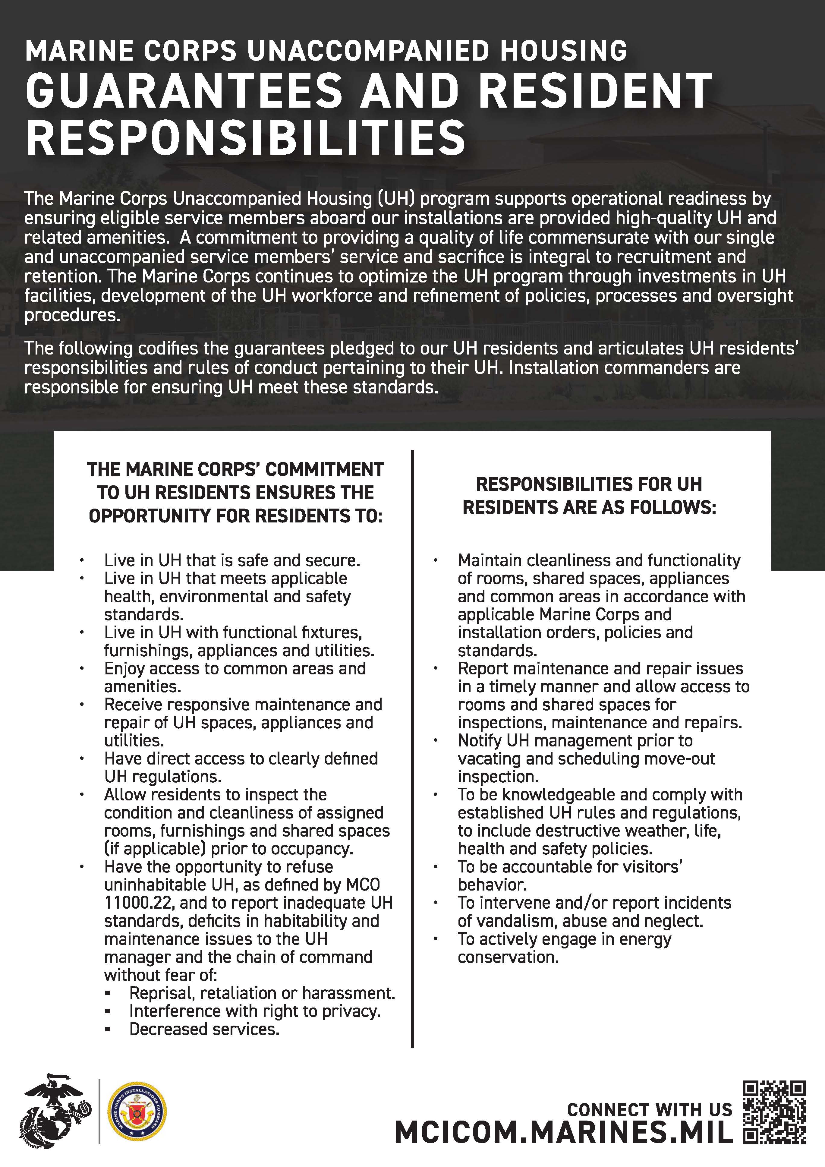Installations commanders will use MARADMIN 289/23 Unaccompanied Housing Guarantees and Responsibilities and DoD Manual 4165.63-M DoD Housing Management Manual to ensure compliance with the Marine Corps’ commitment to its Barracks.