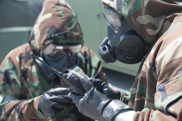 Lance Cpl. Alexis H. Vavages, left, uses an M256A1 chemical agent detector kit to screen simulated chemicals while Cpl. Rachee K. Roberts radios in any detections Aug. 28 during a training event as part of Exercise Ulchi Freedom Guardian at Marine Corps Air Station Futenma. The tests were conducted as a chemical, biological, radiological, and nuclear defense drill. The M256A1 chemical agent detector kit changes color based on various chemicals that may be in the area. Vavages is from Casa Grande, Arizona, and is a supply clerk with Marine Tactical Air Command 18, 1st Marine Aircraft Wing, III Marine Expeditionary Force. Roberts is from Savanna, Georgia, and is an administration specialist with MTAC-18.