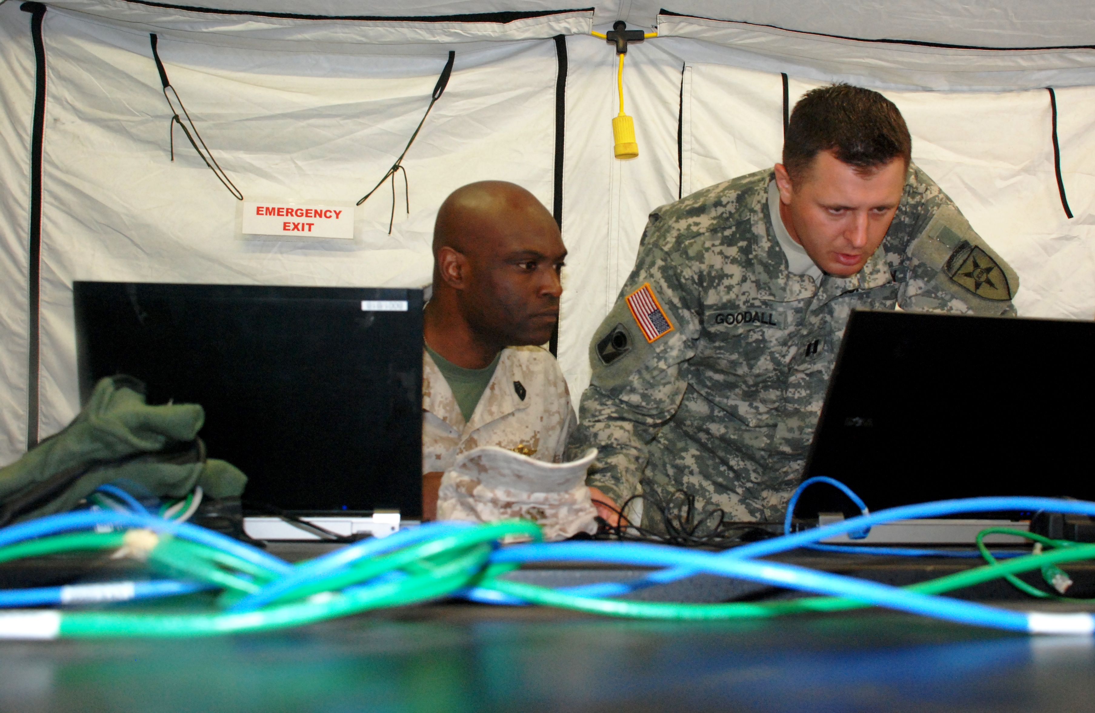 U.S. Army Capt. Thomas J. Goodall, the Deployable Joint Command and Control system detachment commander, works with U.S. Marine Master Sgt. Windle Riles, Marine Forces Africa lead communications planner, to ensure the DJC-2 was up and operational within 48 hours.::r::::n::Exercise African Lion 2011 is an annually scheduled, joint, combined U.S.-Moroccan exercise. It brings together nearly 2,000 U.S. service members from locations throughout Europe and North America with more than 900 members of the Royal Moroccan Armed Forces. It is the largest exercise within the U.S. Africa Command area of responsibility, and is designed to promote interoperability and mutual understanding of each nation’s military tactics, techniques and procedures. All U.S. forces will return to their home bases in the United States and Europe at the conclusion of the exercise.