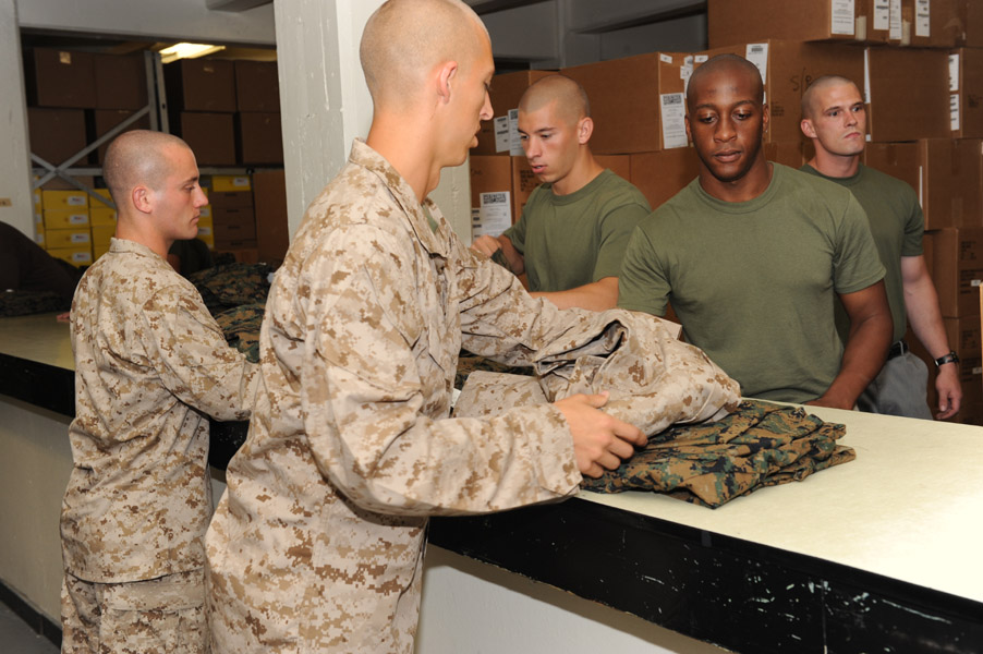 Candidates from Golf Company, Officer Candidate School, receive their uniform issue at the cash sales store aboard Marine Corps Base Quantico, Va., May 26, 2009.
