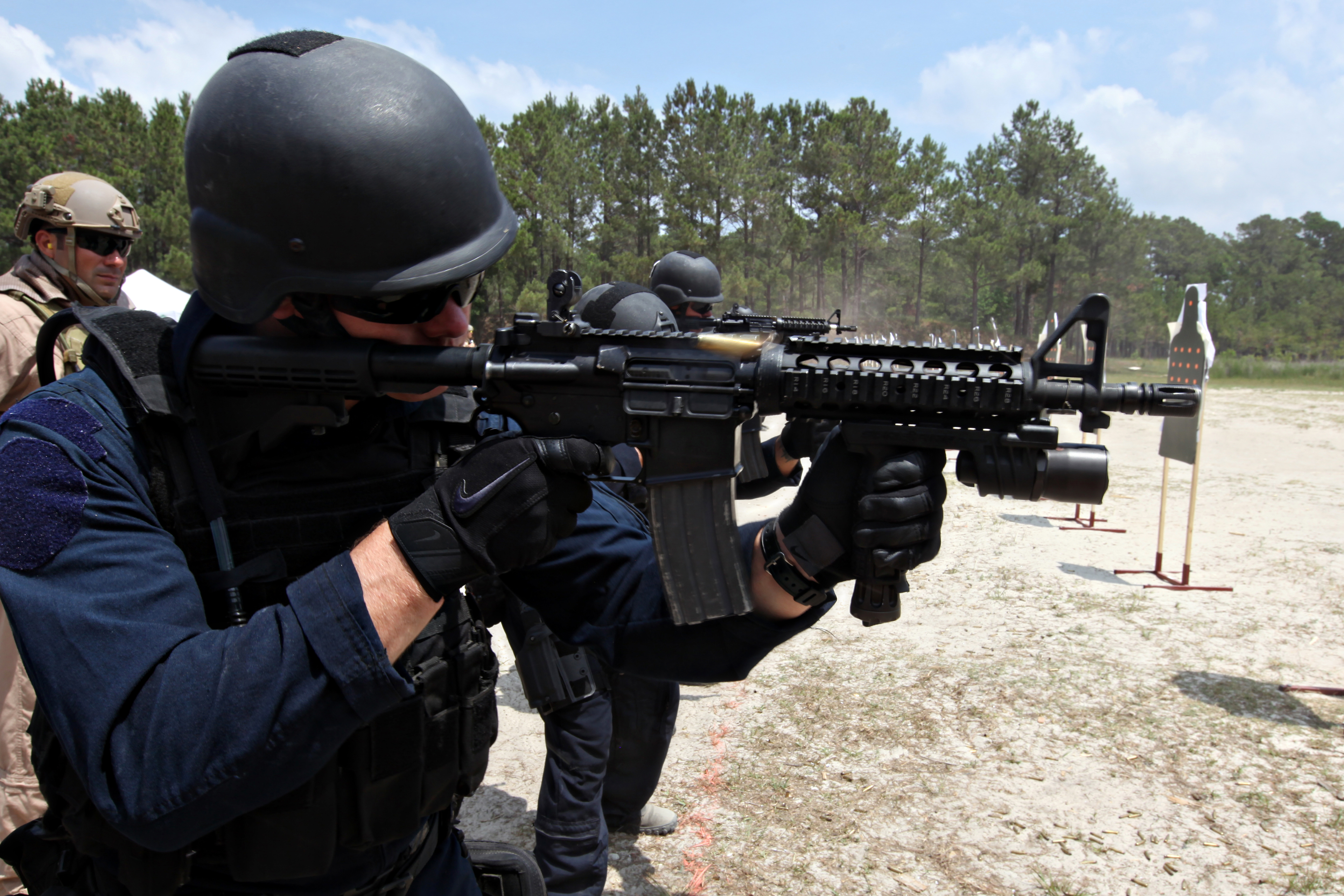 Coast Guard Petty Officer 3rd Class Casey Taylor, a maritime enforcement specialist with Pacific Area Tactical Law Enforcement Team, Marine Corps Recruit Depot San Diego, and student of the Basic Tactical Operations Course, fires a MK-18, which is an M-4 with the close-quarters battle receiver, making it more than four inches shorter than a regular M-4. The BTOC is a course at the Joint Maritime Training Center aboard Marine Corps Base Camp Lejeune that offers members of the Coast Guard’s Deployable Specialized Forces the basics of marksmanship.