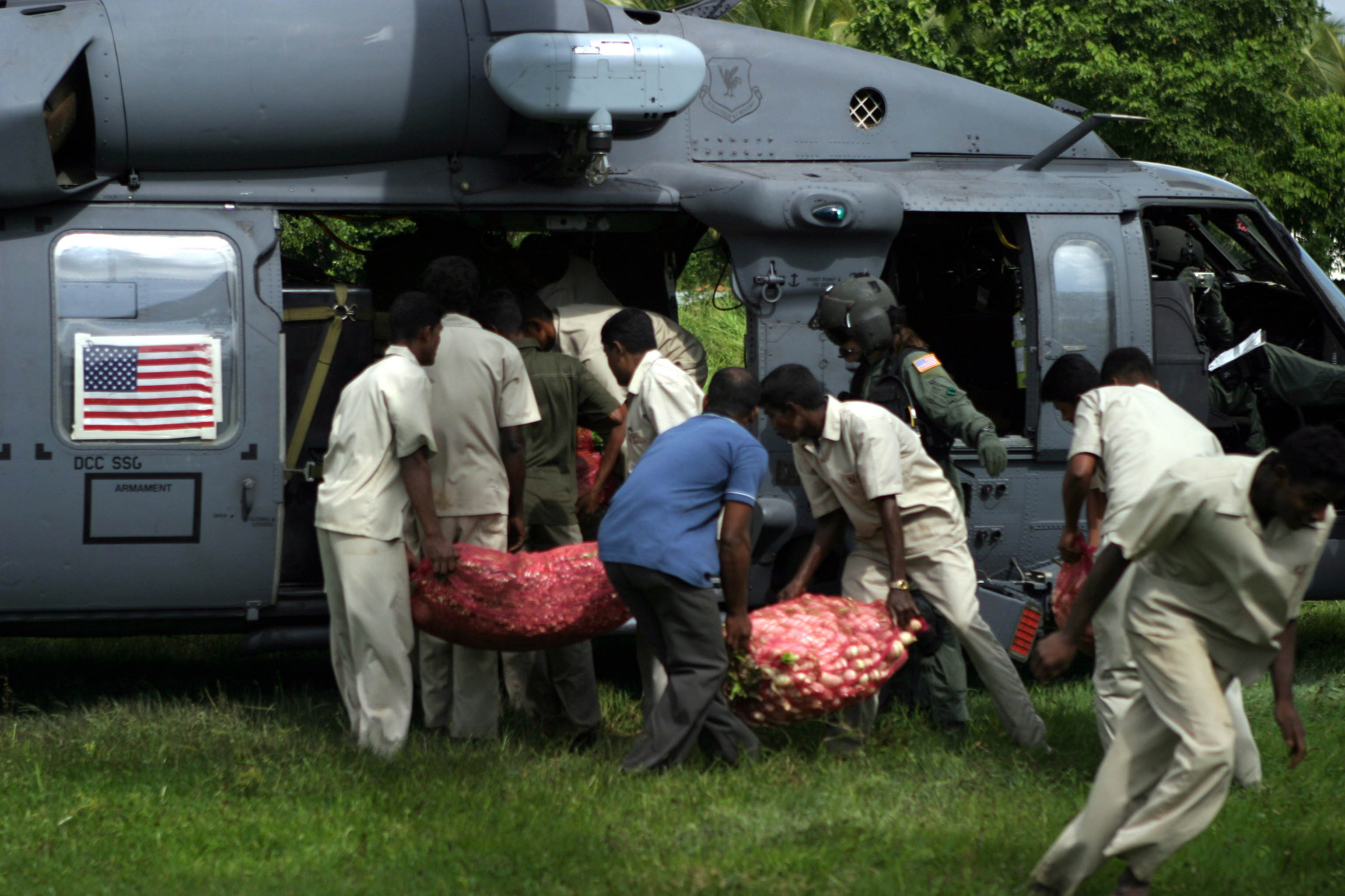 050113-M-1158H-005 DAMBULLA, Sri Lanka -- Sri Lankan relief workers load vegetables onto a U.S. Air Force HH-60 Pavehawk helicopter from the Okinawa, Japan-based 33rd Rescue Squadron for transport to Ampara, Sri Lanka, Jan. 13 as part of Combined Support Group-Sri Lanka's humanitarian assistance and disaster relief operations in the country. To date, U.S. helicopters have delivered about 250,000 pounds of relief supplies to the tsunami-affected people of Sri Lanka in the south and east, including fresh vegetable deliveries totaling more than 30 tons. Also, U.S. personnel in southern Sri Lanka have completed multiple projects to clear schools, municipal buildings and residential areas of the debris left in the wake of the tsunami. CSG-SL continues to coordinate relief support closely with the Sri Lankan government and the U.S. Agency for International Development. The combined support group, currently comprised of more than 1,600 U.S. Marines, sailors, soldiers and airmen, mostly from U.S. bases in Okinawa, Japan, and California began arriving three weeks ago to assist the people of Sri Lanka. (Official U.S. Marine Corps photo by Lance Cpl. Hugh S. Holder III)(Released)