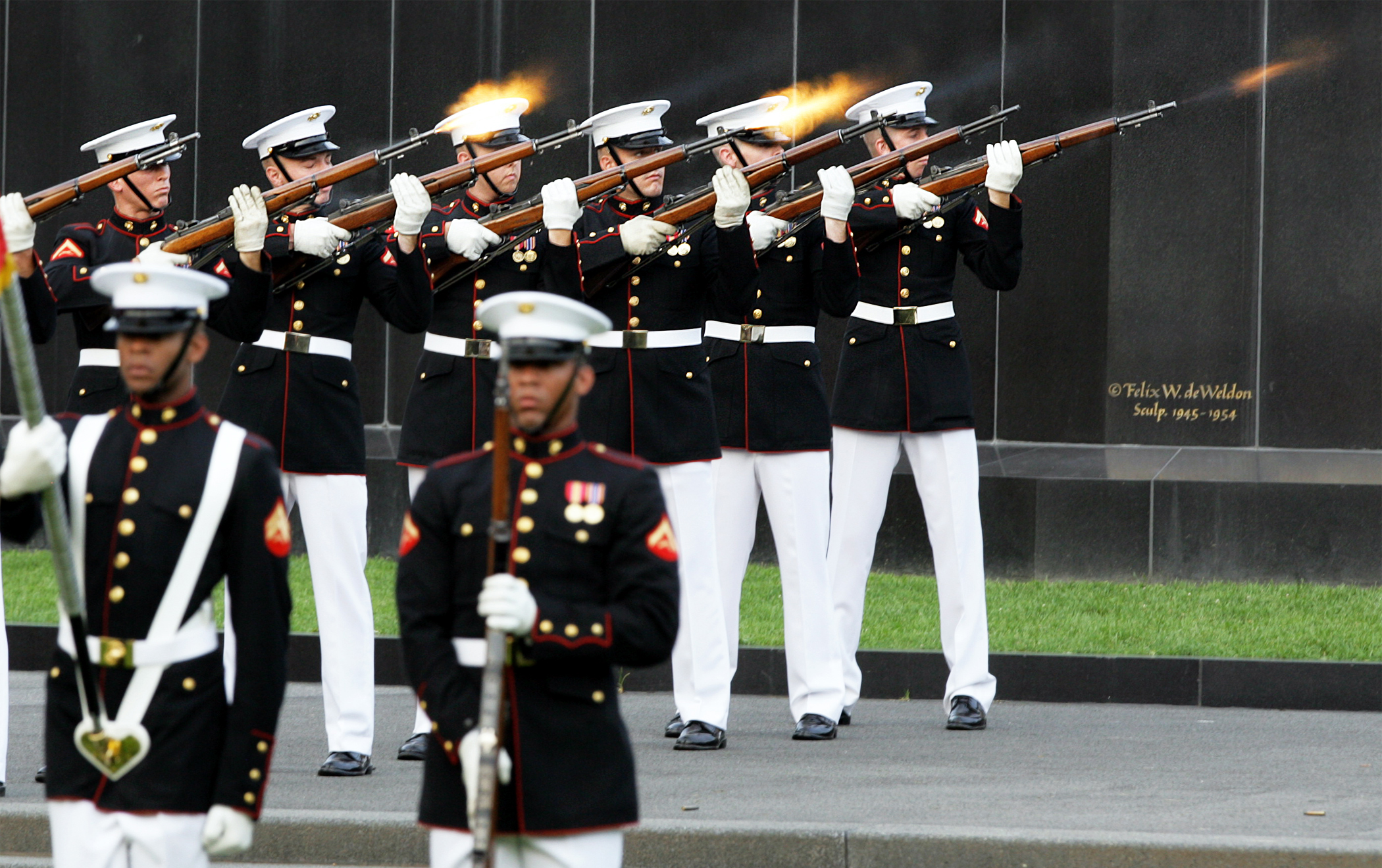 Marines with the Silent Drill Platoon fire three shots during the playing of Taps in honor of the fallen service members from America's wars at the Marine Corps War Memorial Aug. 3. The night's guest of honor was Medal of Honor recipient retired Air Force Col. George 'Bud' Day. Day has served in three different military services, including the Marine Corps, during three different wars and is America's most decorated living military officer. During his time as an Air Force pilot in Vietnam, Day was captured by North Vietnam forces. During his captivity he escaped, becoming the only prisoner of war to do so, but after two weeks of evasion, he was recaptured by Viet Cong forces. He was finally released in 1973.