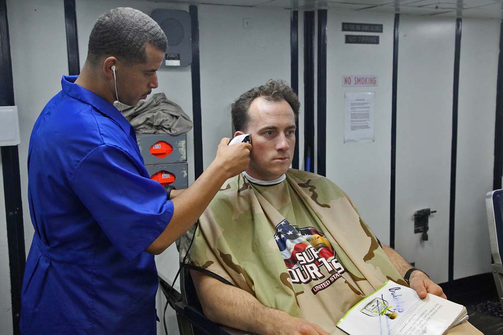 Sergeant Jordan Kelly, chief, Fire Control Team 32, Air Naval Gunfire Liaison Company, Command Element, 15th Marine Expeditionary Unit, gives a haircut to his team leader, Capt. Collin Hannigan, FCT 32 team leader, aboard the USS Rushmore, Jan. 22. The 15th MEU is deployed as part of the Peleliu Amphibious Ready Group as a U.S. Central Command theater reserve force, providing support for maritime security operations and theater security cooperation efforts in the U.S. 5th Fleet area of responsibility. Kelly, 25, is from Mexico, Mo., and Hannigan, 30, Fairfax, Va. (U.S. Marine Corps photo by Cpl. Timothy R. Childers)