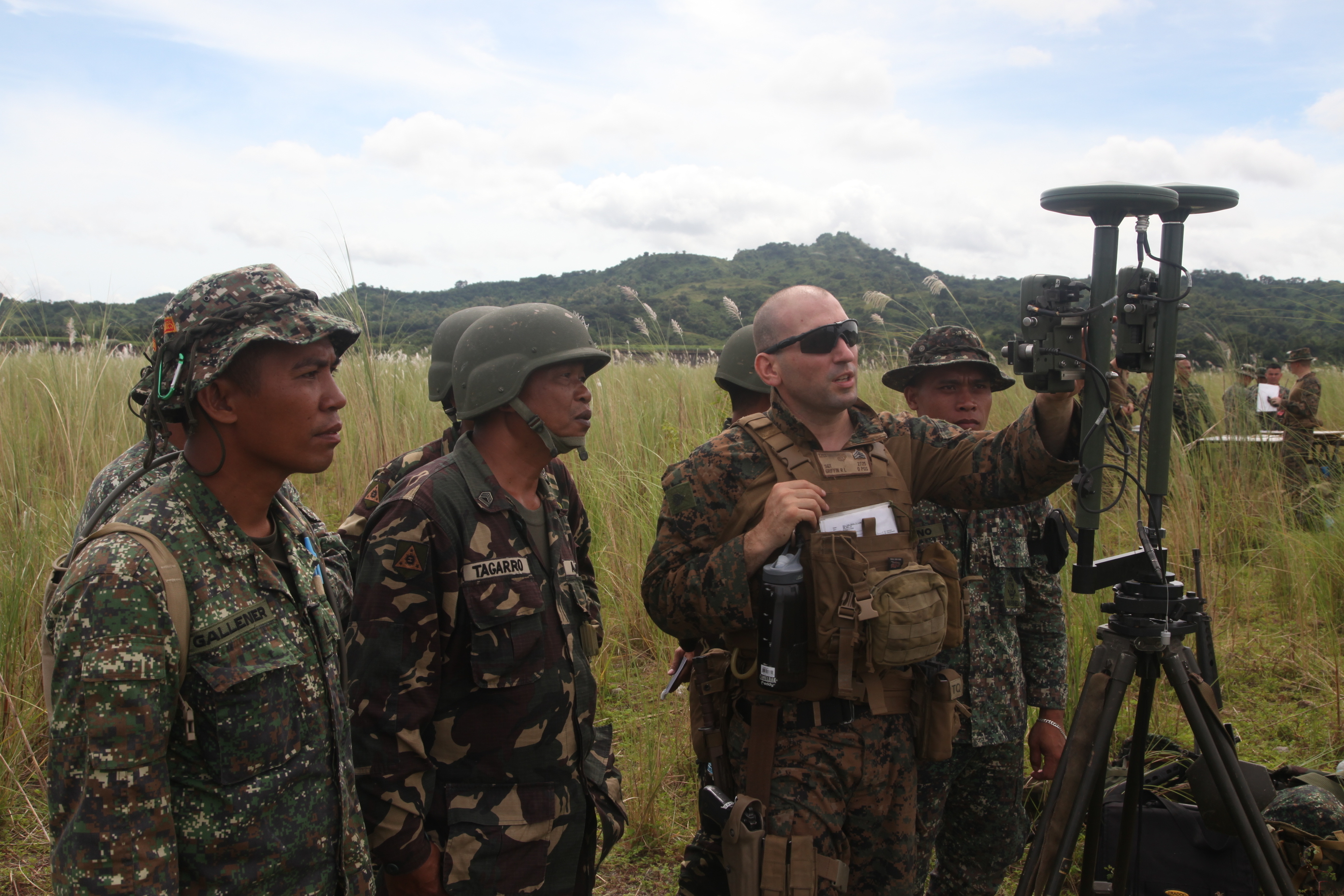 U.S. Marine Sgt. Reid L. Griffin discusses the purpose of establishing a proper orientation for directing a M101 105-mm Towed Howitzer with Philippine Marine and Army personnel during Amphibious Landing Exercise (PHIBLEX) 2014 at the Crow Valley Range Complex in Tarlac province, Republic of the Philippines. Bilateral Philippine-U.S. Marine Corps training sustains and reinforces the foundation and framework for a bilateral force to respond rapidly and effectively to regional humanitarian crises. Griffin is an artillery meteorological man with Battalion Landing Team 1st Battalion, 4th Marine Regiment, 13th Marine Expeditionary Unit. (Photo by Lance Cpl. David Hersey)