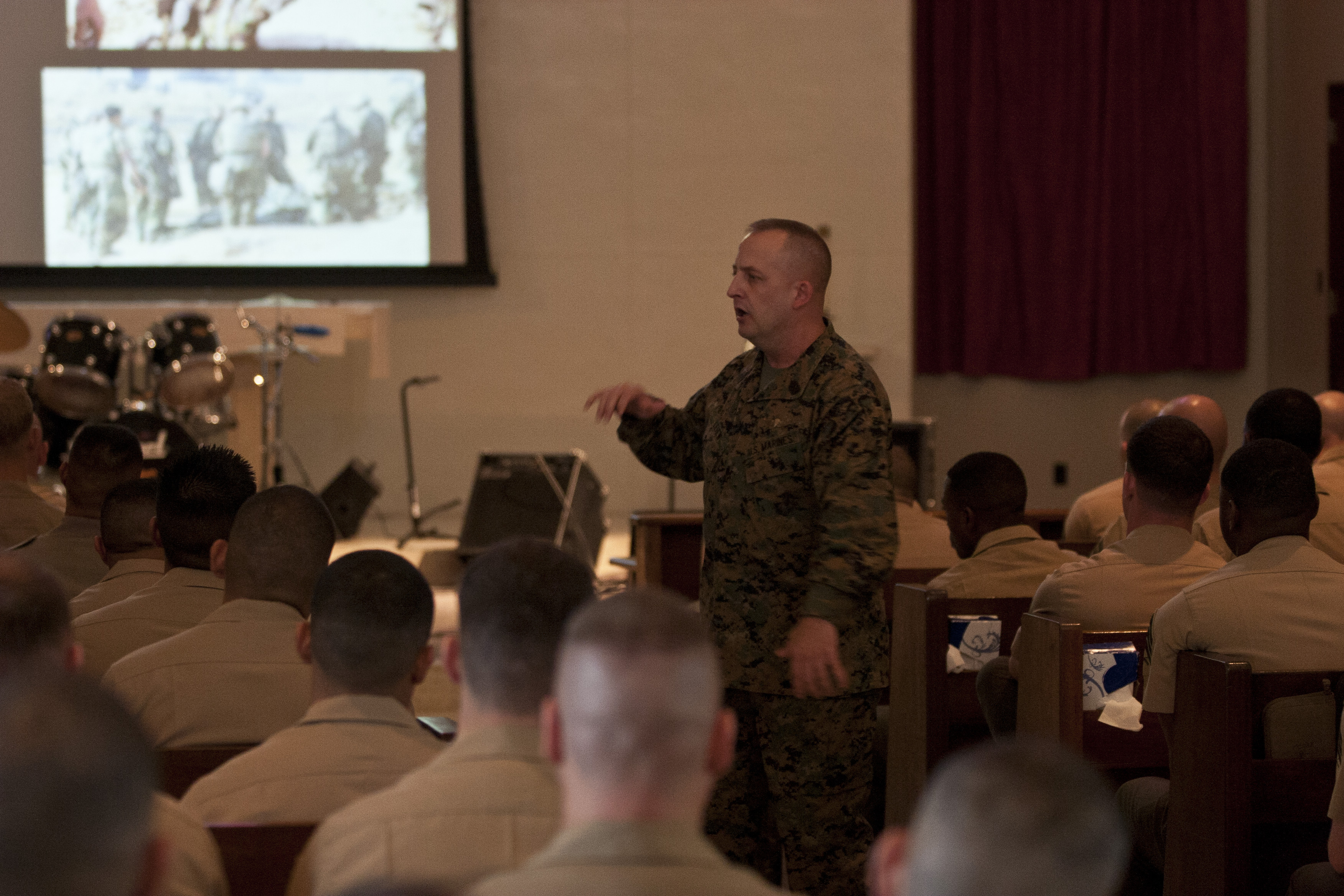 Sgt. Maj. Justin D. Lehew speaks with students and faculty participating in the Staff Non-Commissioned Officers Academy Feb. 6 at the West Chapel on Camp Hansen regarding his personal experiences in the Marine Corps and how those in attendance can expand their knowledge of history and tradition. Lehew earned the Navy Cross, the second highest award for combat valor after the Medal of Honor, for his actions March 23-24, 2003 during the Battle of An-Nasiriyah. The battle took place during the initial invasion of Iraq, in support of Operation Iraqi Freedom. Lehew is the command sergeant major of Training and Education Command, Headquarters Marine Corps.