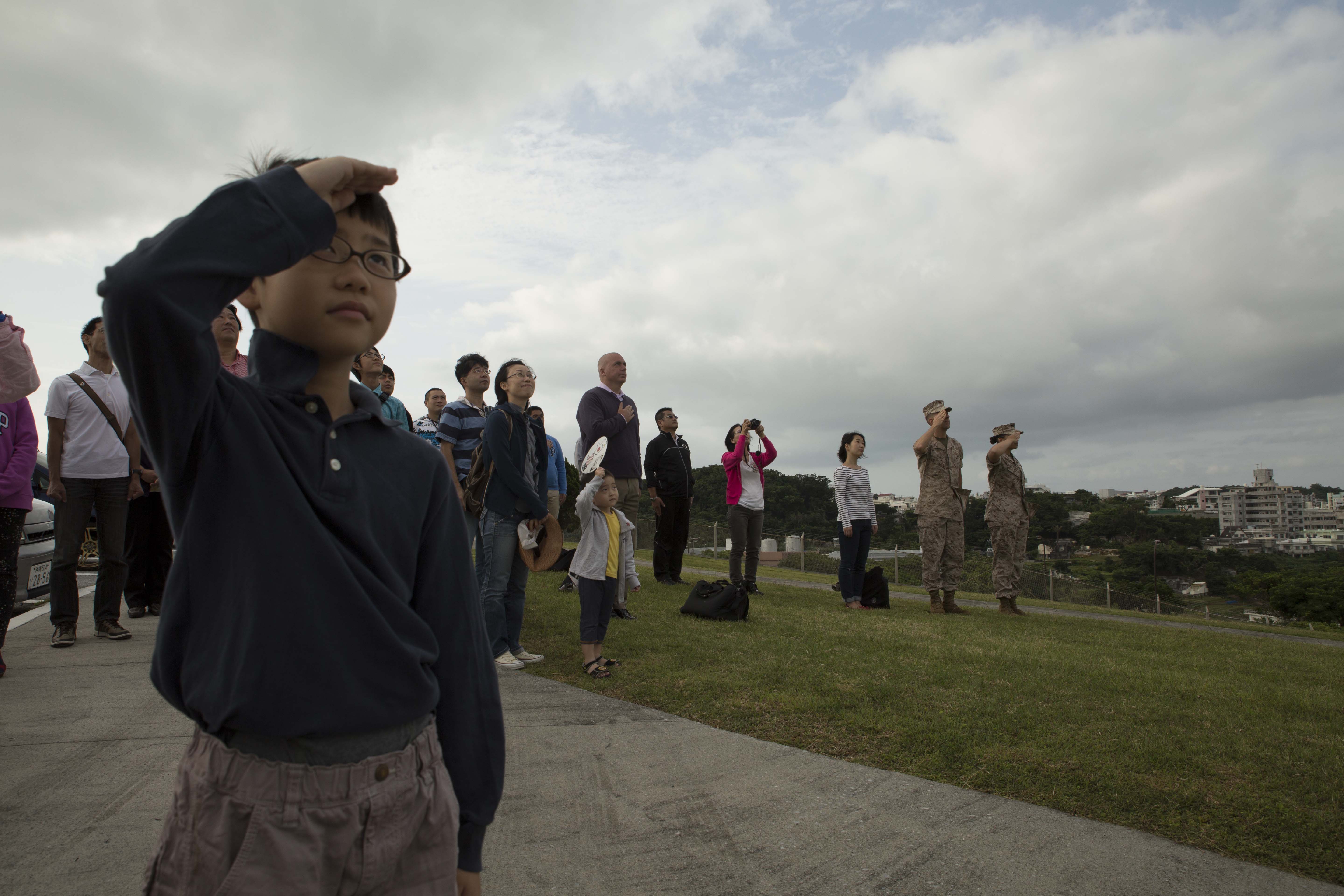An Okinawa child salutes the national ensigns of the U.S. and Japan April 29 at Camp Foster during a community outreach seminar called Marine Corps 101. The event allows Okinawa citizens the opportunity to learn the history of the U.S. Marine Corps and see military life on the installations. The tour is a regular function that helps strengthen ties between the two nations.