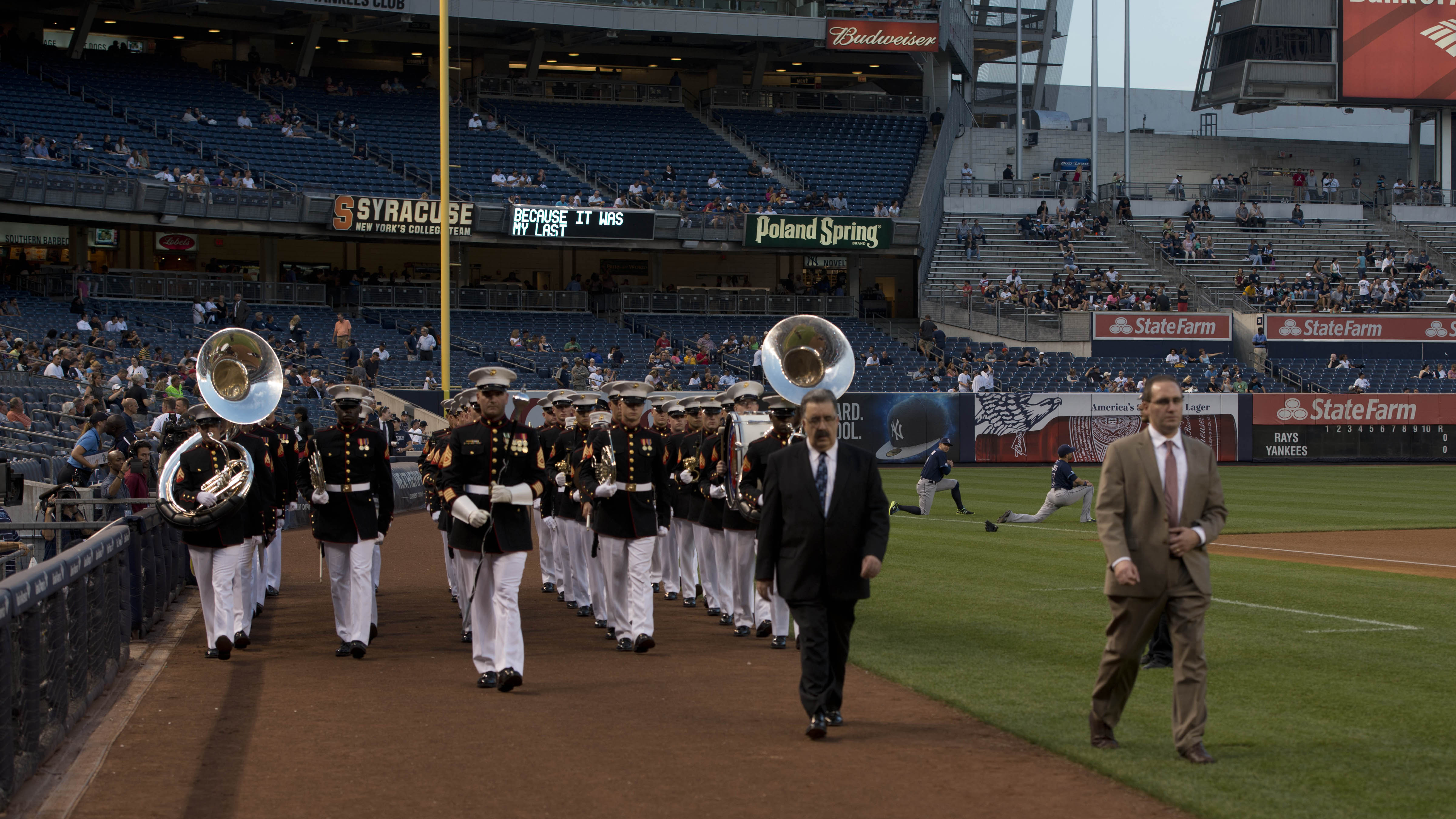 Led by Gunnery Sgt. Mark G. Bender, a drum major, the Quantico Marine Band marches onto Yankee Stadium Sept. 11, 2014, at New York City. The band went to the stadium to perform the National Anthem in respect to the people, who lost their lives 13 years ago during the 9/11 attacks on the World Trade Center.