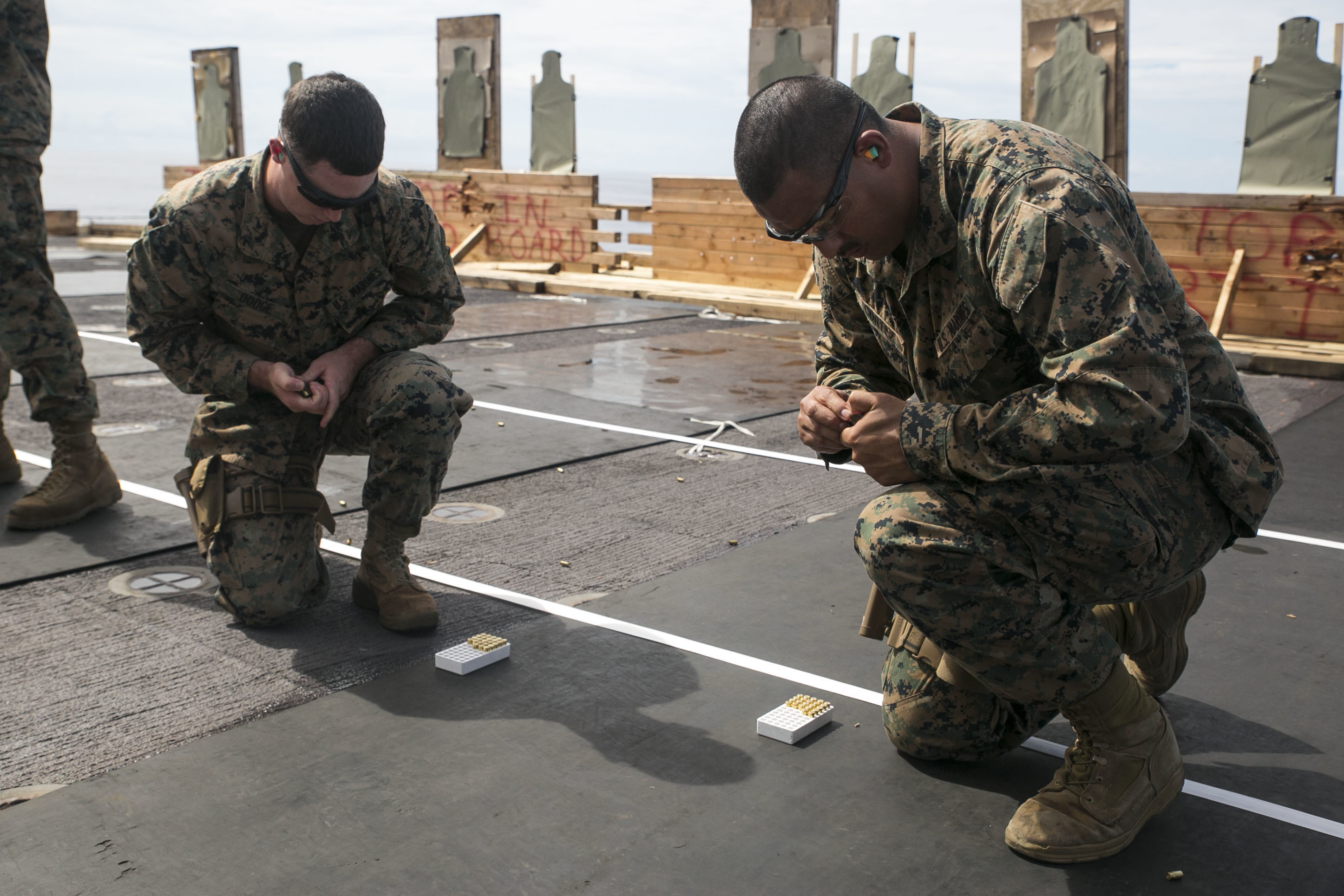Lance Cpls. Kevin A. Cortez, right, and Brandon D. Dodge load magazines Oct. 31 on the flight deck of the USNS Sacagawea. Marines further developed their marksmanship fundamentals during two days of live-fire. The live-fire was conducted as training for the Marines participating in T-AKE 14-2, a maritime pre-positioned force, multi-country theater security cooperation event which deployed from Okinawa and traveled the Asia-Pacific area of operations. Cortez, from San Antonio, Texas, is a ground radio repairman, and Dodge, from New Bern, North Carolina, is a field radio operator. Both are assigned to the Provisional Rifle Platoon with Combat Logistics Detachment 379, Headquarters Regiment, 3rd Marine Logistics Group, III Marine Expeditionary Force.