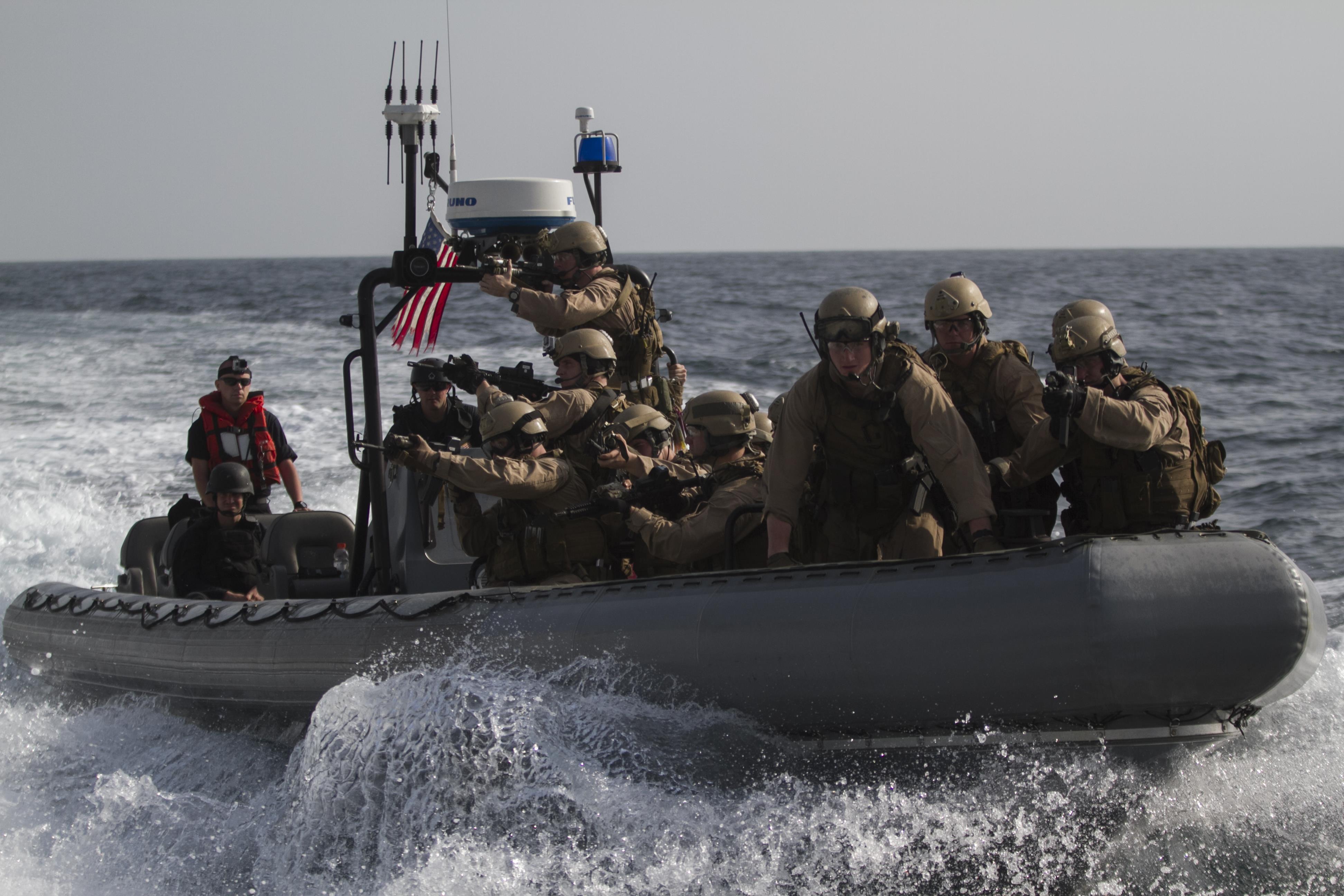Members of the 24th Marine Expeditionary Unit’s Maritime Raid Force, a detachment from Force Reconnaissance Company, 2nd Reconnaissance Battalion, prepare to board a simulated enemy vessel during a visit, board, search and seizure exercise aboard a rigid-hulled inflatable boat, Jan. 15, 2015. The MRF conducted the VBSS exercise from the amphibious dock landing ship USS Fort McHenry (LSD 43). The 24th MEU is embarked on the ships of the Iwo Jima Amphibious Ready Group and deployed to maintain regional security in the U.S. 5th Fleet area of operations. (U.S. Marine Corps photo by Lance Cpl. Dani A. Zunun)