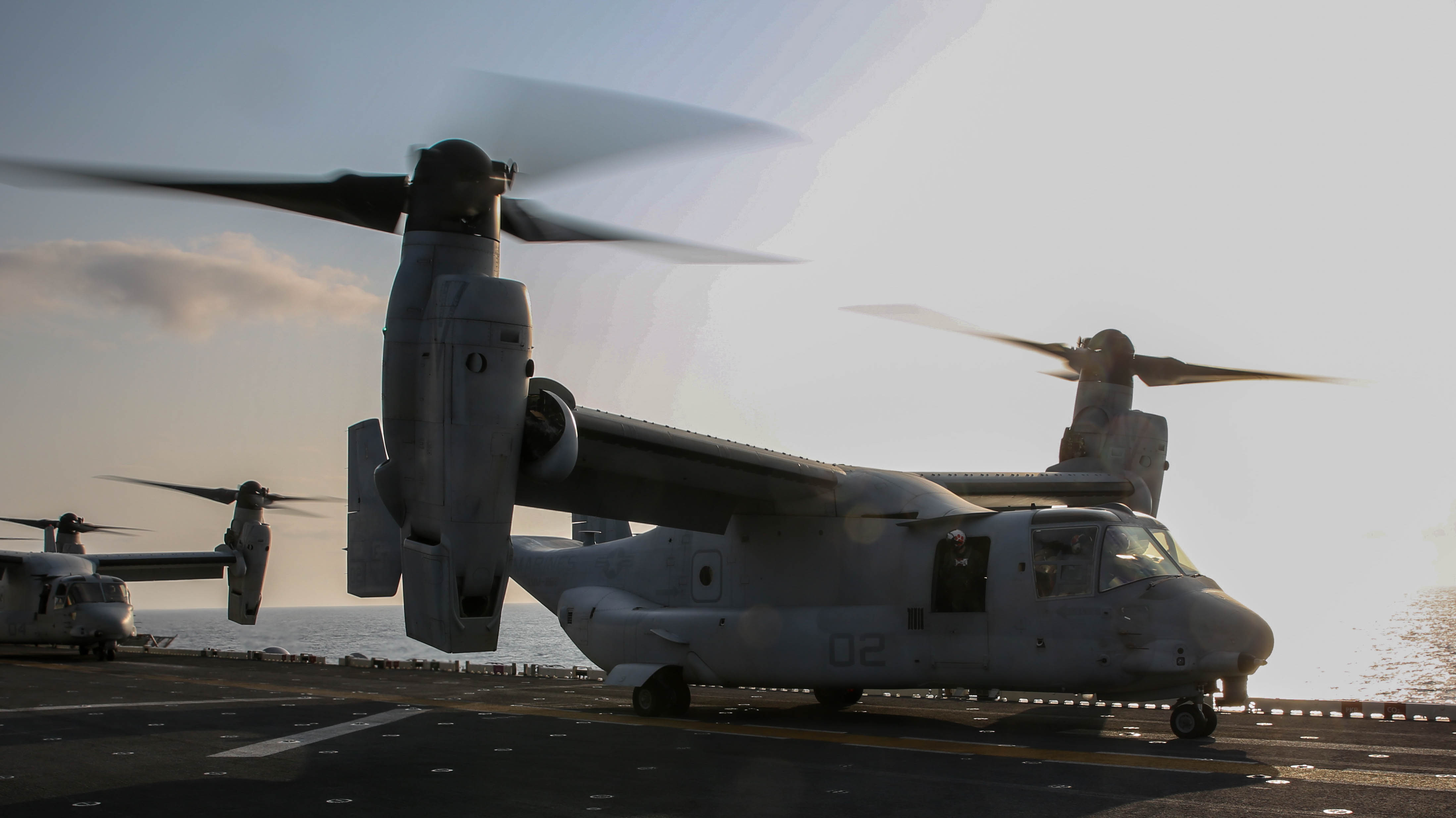 U.S. Marine Corps MV-22B Ospreys prepare to take off from the flight deck of the USS Bonhomme Richard (LHD 6) March 19, 2015. The Ospreys are transporting Marines to Ie Shima, Okinawa, Japan to execute a vertical assault exercise. The Ospreys are with Marine Medium Tiltrotor Squadron 262, 31st Marine Expeditionary Unit. The Marines are with Company E., Battalion Landing Team 2nd Battalion, 4th Marines, 31st MEU and are currently on the annually scheduled Spring Patrol of the Asia-Pacific region.