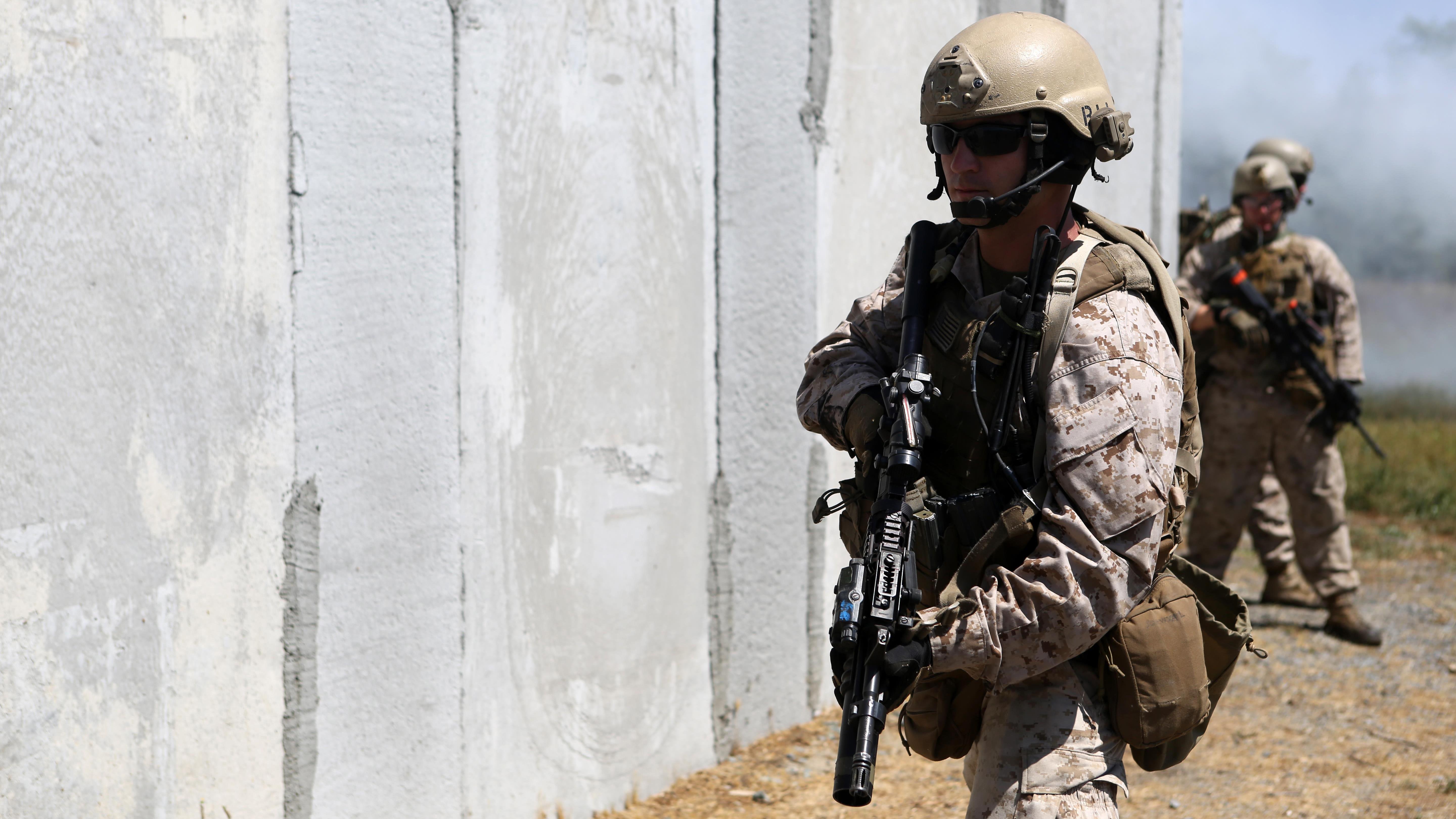 Staff Sgt. Kermit Hatfield, team leader, Charlie Company, 1st Reconnaissance Battalion, provides security during a live-fire raid at Range 226 aboard Camp Pendleton, California, April 1, 2015. Hatfield, a native of Butler, Indiana, and the company conducted the live-fire exercise as part of a pre deployment workup in support of the 13th Marine Expeditionary Unit. (U.S. Marine Corps photo by Sgt. Joseph Scanlan/released)