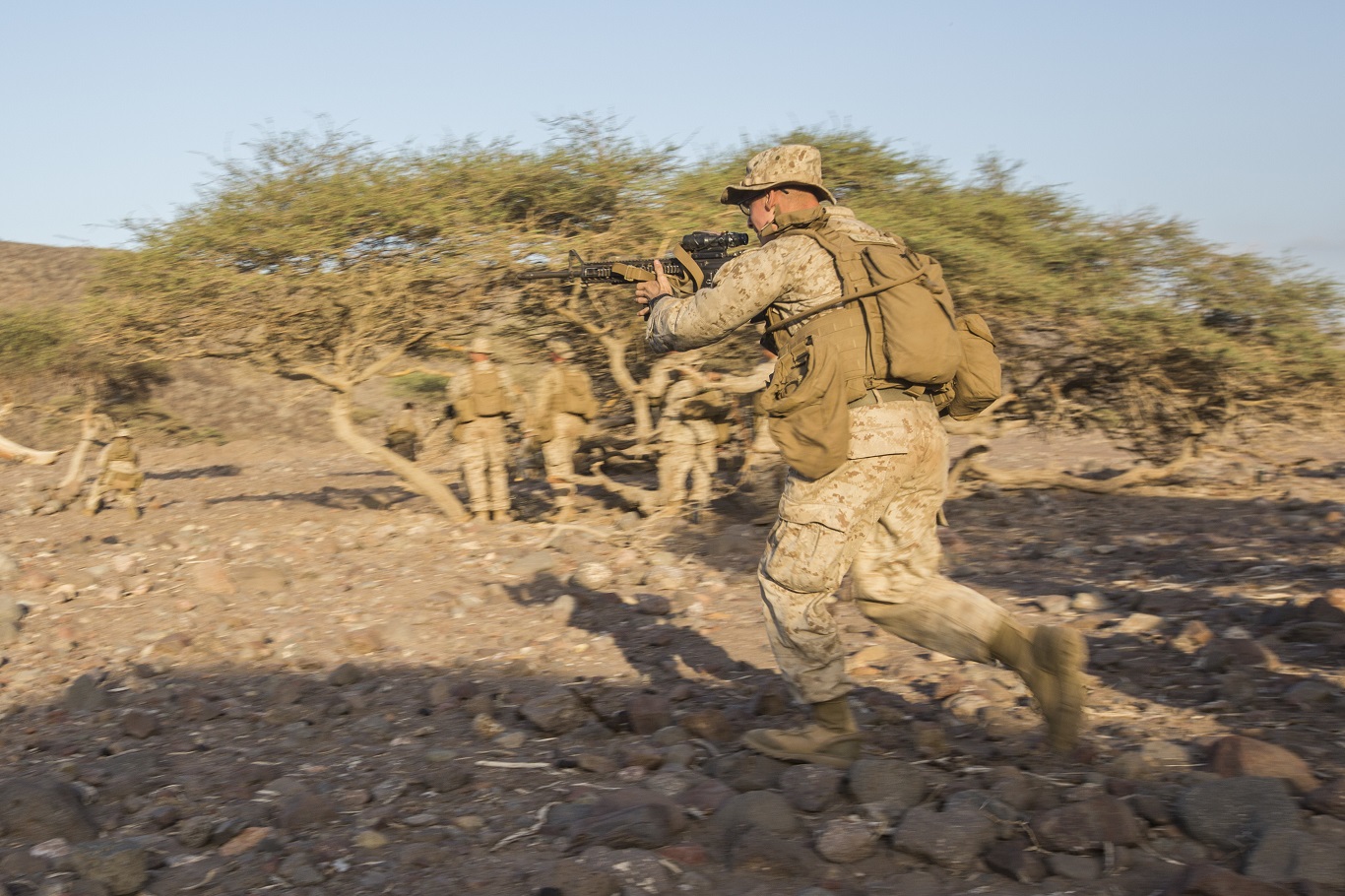 U.S. Marines with the 13th Marine Expeditionary Unit conduct basic marksmanship drills in Djibouti , Africa, Apr. 11, 2016. The 13th MEU is conducting sustainment training to maintain proficiency and combat readiness as part of the Boxer Amphibious Ready Group on a scheduled deployment to the Western Pacific area of responsibility. (U.S. Marine Corps photo by Cpl. Alvin Pujols/RELEASED)