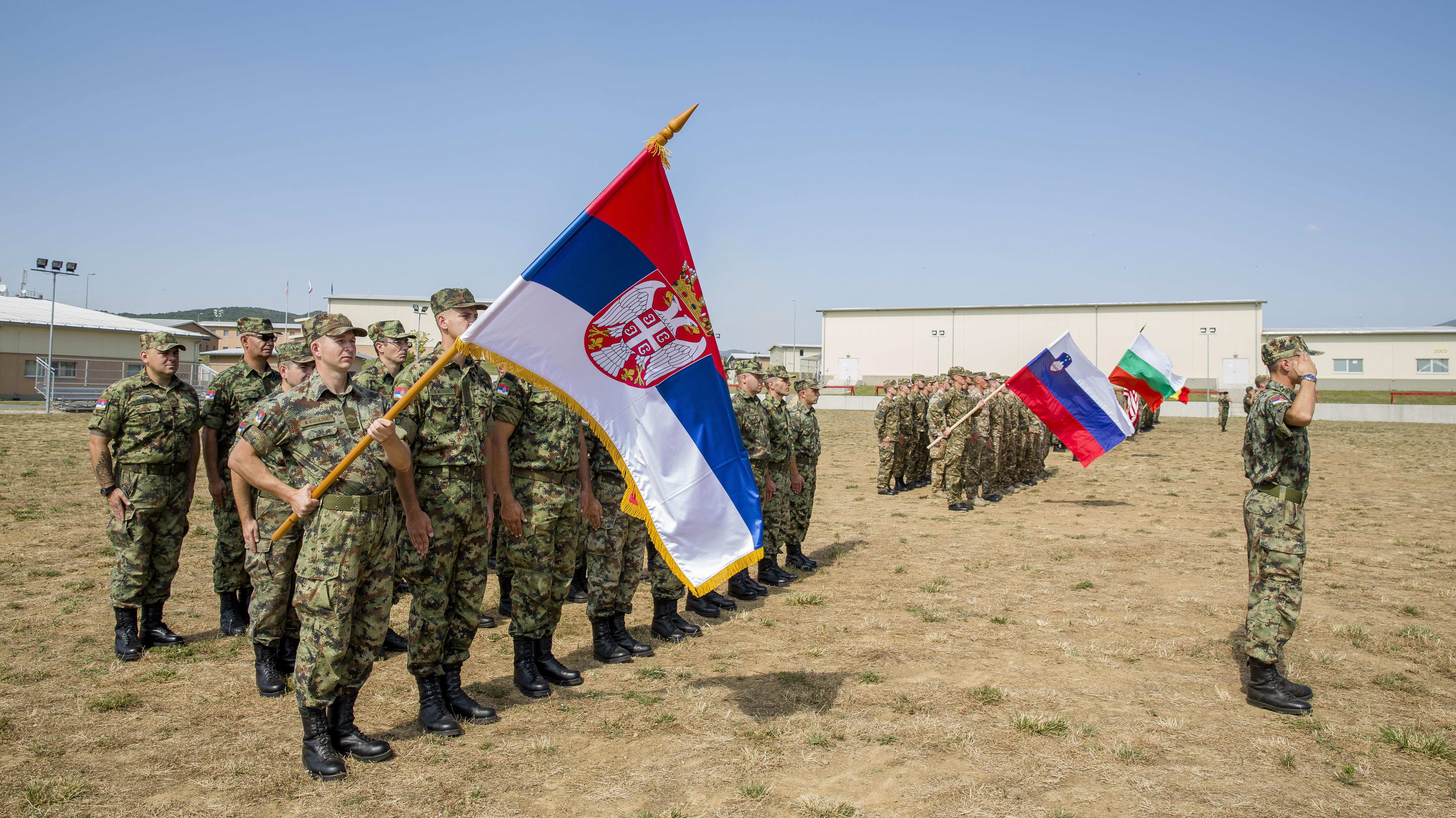 NATO and partner nations salute for the playing of each nation’s national anthem during the opening ceremony of Exercise Platinum Lion 16-4 at Novo Selo Training Area, Bulgaria, July 11, 2016. Platinum Lion is a large scale exercise where eight NATO and partner nations came together for a multi-national, live-fire exercise aimed to strengthen regional defense.