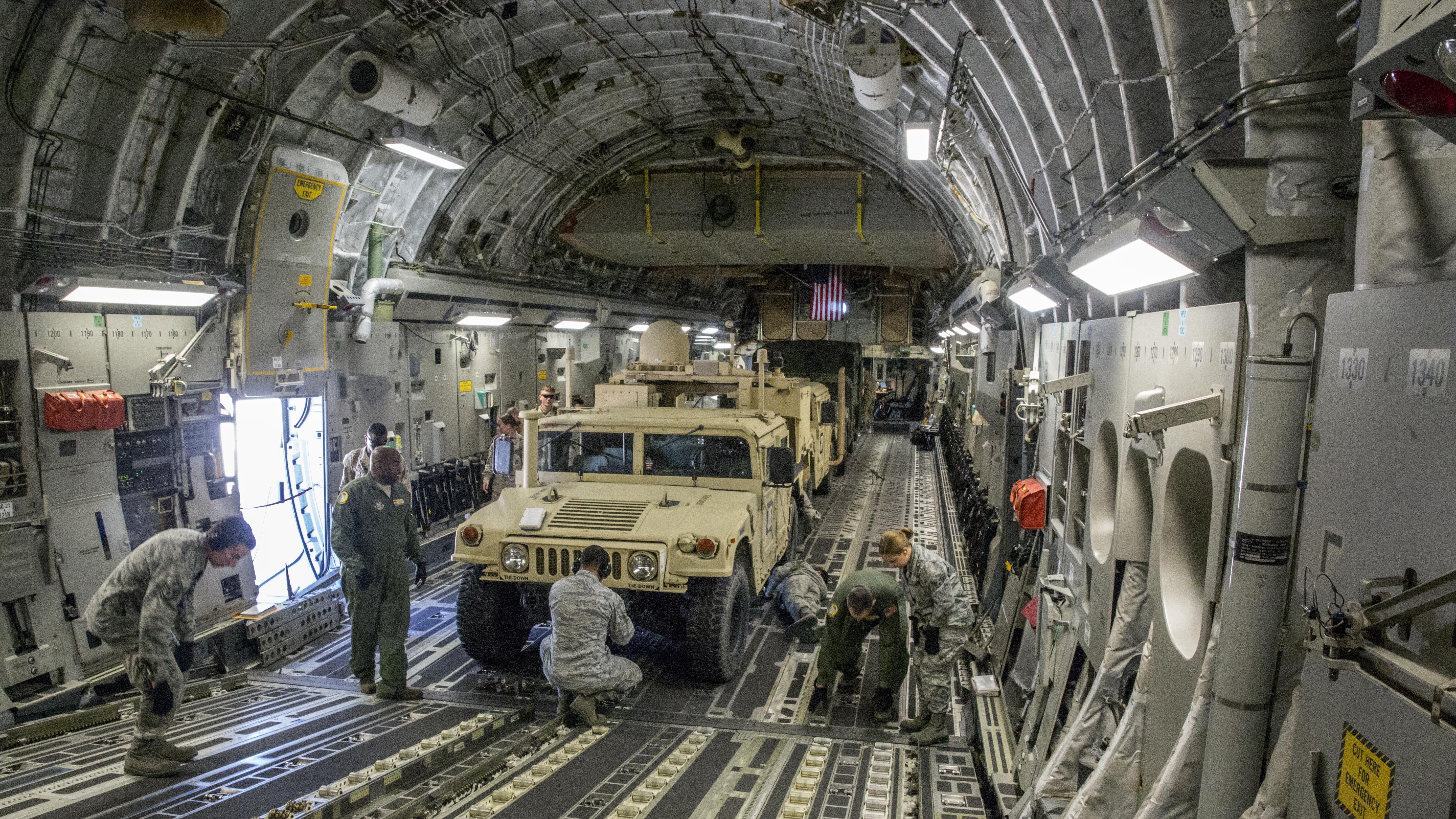 Airmen with 50th Aerial Port Squadron, 452nd Air Mobility Wing, strap down three Marine Corps High Mobility Multipurpose Wheeled Vehicles that are parked in the loading bay of an Air Force C-17 Globemaster III aircraft during Strategic Mobility Exercise at March Air Force Reserve Base, Calif., March 12, 2017. STRATMOBEX is a training exercise conducted by the 1st Marine Logistics Group in order to maintain readiness and sharpen skills needed to rapidly deploy personnel and equipment on a large scale.
