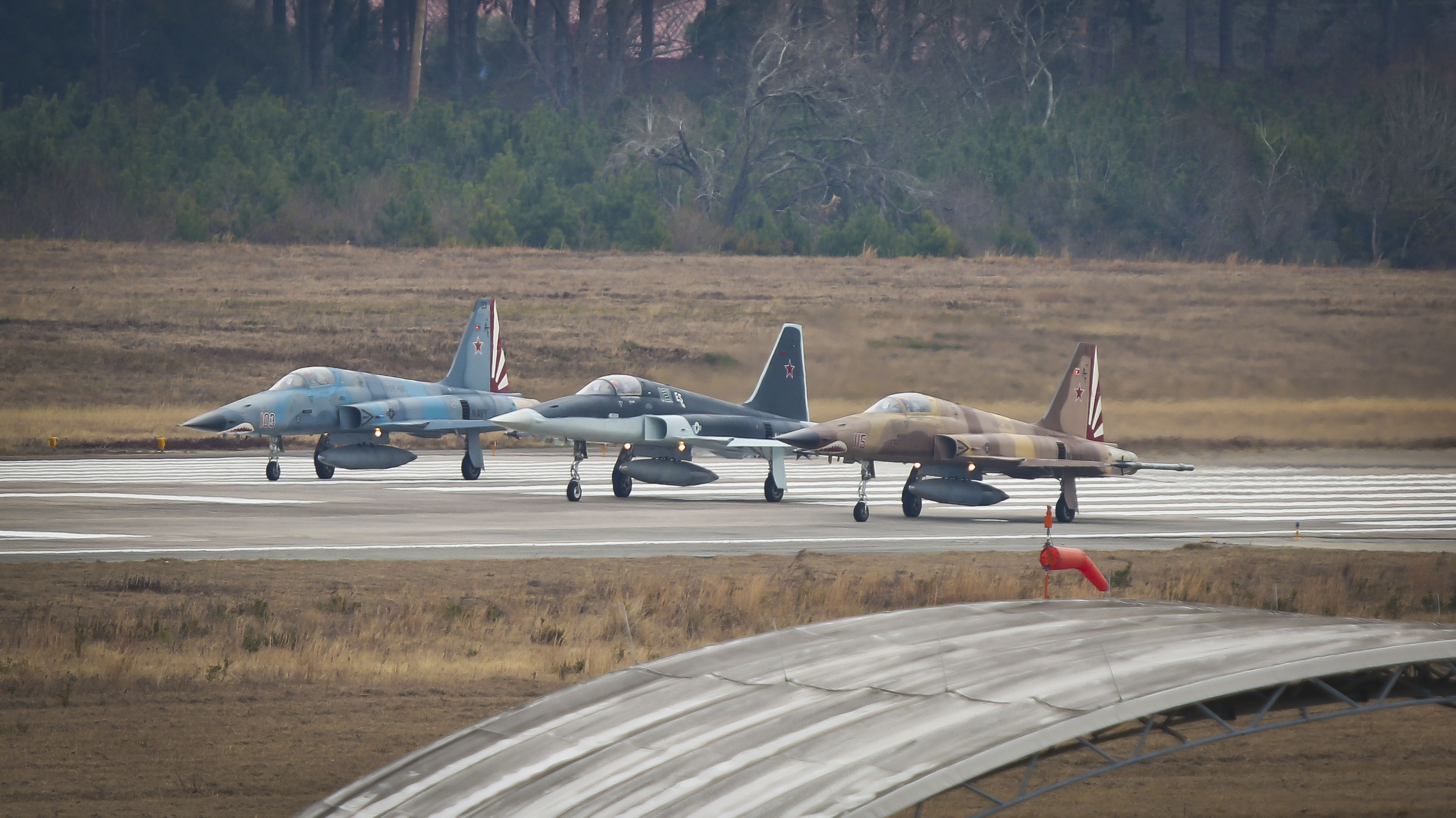 F-5N Freedom Fighters prepare to takes off from Marine Corps Air Station Beaufort Jan. 17. Marine Fighter Attack Training Squadron 501 is training with Naval Fighter Composite Squadron 111 from Jan. 8 to Jan. 22. The Sundowners are here as a training tool to provide adversary air for the Warlords. The F-5N Freedom Fighter simulates an enemy aircraft which provides realistic training outside of a simulator. The F-5N’s are with VFC-111.