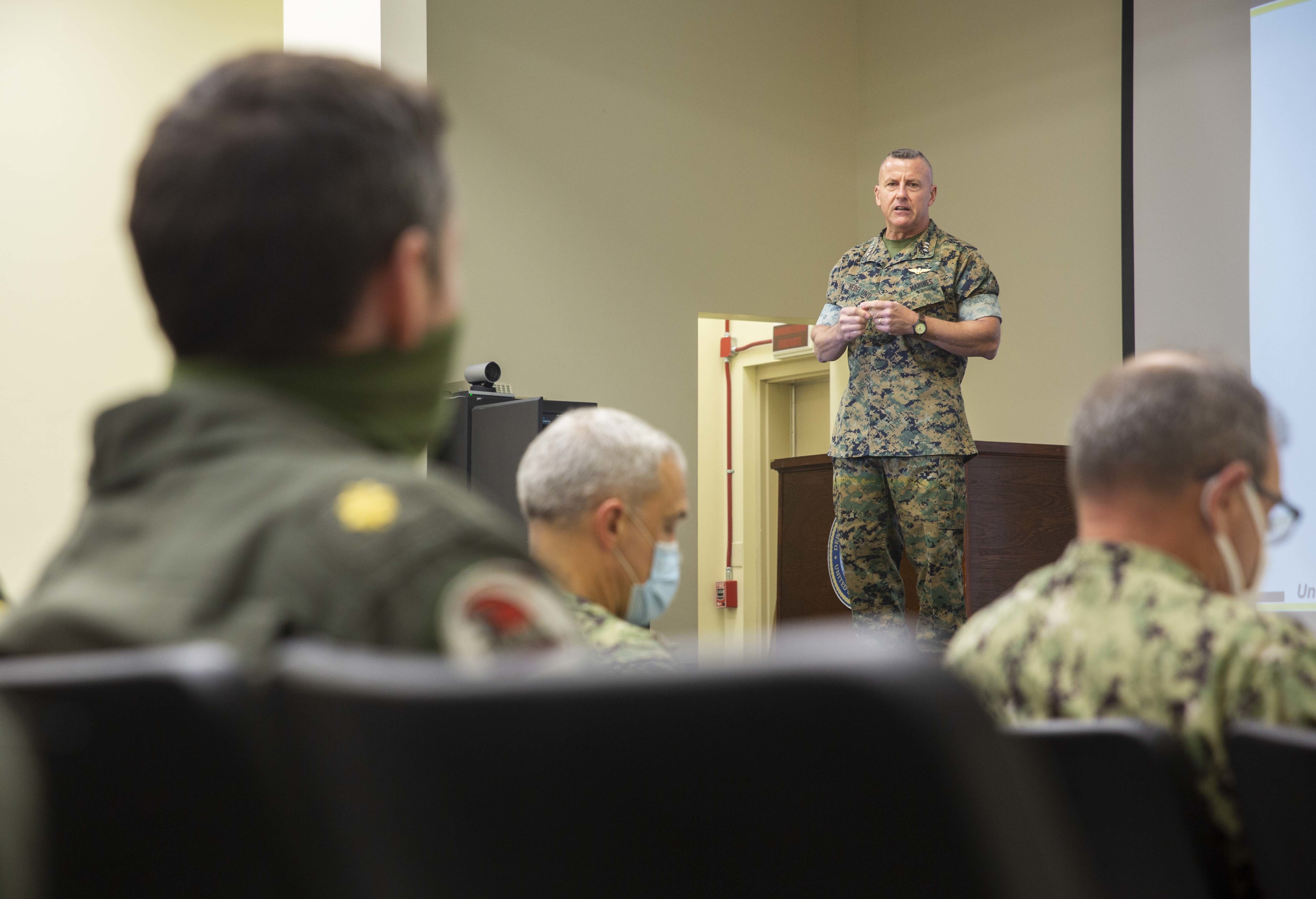 A U.S. Marine talks to the audience during the 24th Marine Expeditionary Unit Staff Planning Course on Naval Station Little Creek, Va., Aug. 10.