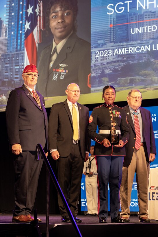 U.S. Marine Corps Sgt. Nhatalyne Bordes, a legal chief, office of the Staff Judge Advocate, with Headquarters and Headquarters Squadron, Marine Corps Air Station New River, poses for a photo during the 104th American Legion National Convention in Charlotte, North Carolina, Aug. 29, 2023. Bordes received the 2023 American Legion Spirit Service Award for the U.S. Marine Corps. (U.S. Marine Corps photo by Cpl. Jennifer E. Douds)
