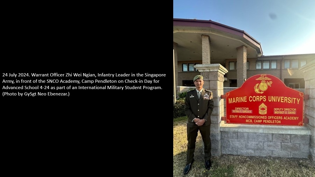 24 July 2024. Warrant Officer Zhi Wei Ngian, Infantry leader in the Singapore Army, in front of the SNCO Academy, Camp Pendleton on Check-in Day for Advanced School 4-24 as part of an International Military Student Program. (Photo by GySgt Neo Ebenezar.)