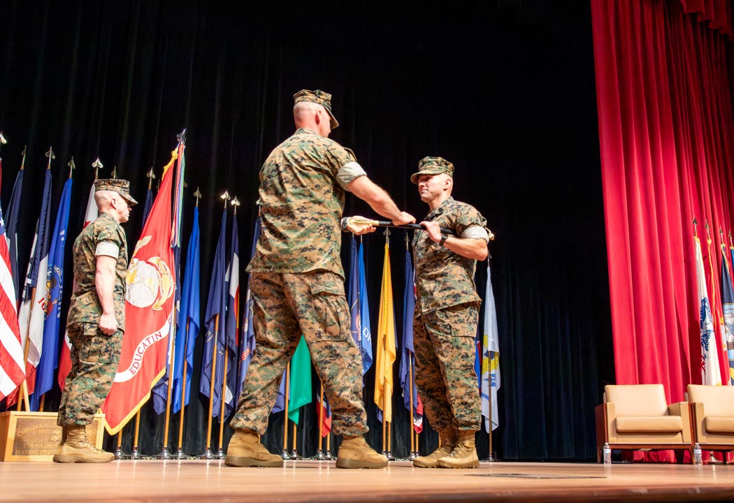 Relief & Appointment (8 Jul 2025). Education Command/Marine Corps University bids farewell to SgtMaj Stephen J. Lutz Jr. as he relinquishes his position to SgtMaj. George Garcia III, former director of the Staff Non-Commissioned Officer Academy Camp Pendleton. BGen Matthew Tracy, Commanding General of EDCOM/President of MCU, receives the sword of office from Lutz and passes it to Garcia, signifying the transfer of responsibility and authority. (Photo by Mr. Thanh Truong)