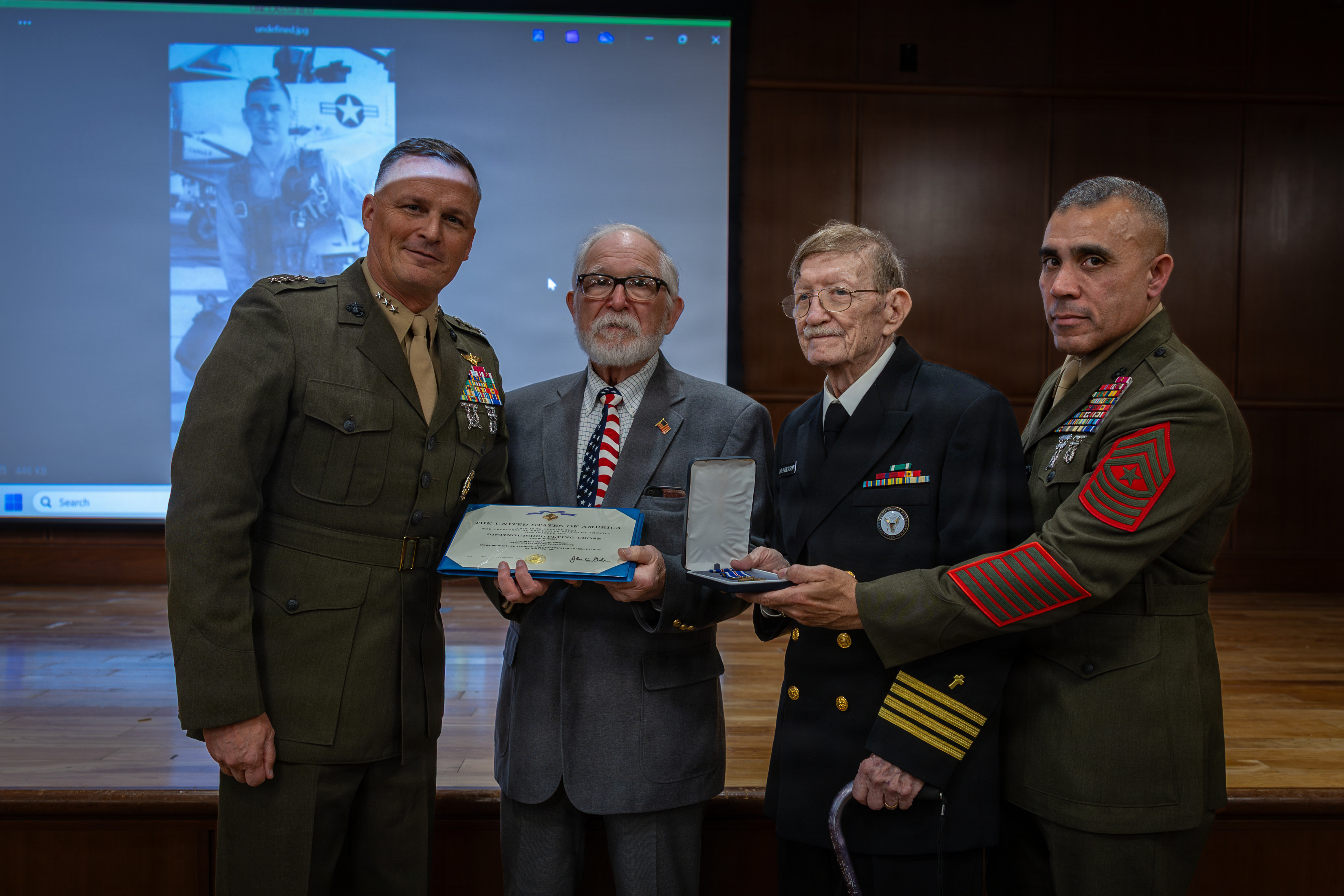Allan and Raymond McPherson, center, brothers of the late Maj. Everette McPherson, pose for a photo with Lt. Gen. Leonard F. Anderson IV, left, commander of Marine Forces Reserve and Marine Forces South, and Sgt. Maj. Edwin A. Mota, right, senior enlisted leader of Marine Forces Reserve and Marine Forces South, during a posthumous Distinguished Flying Cross ceremony honoring the heroic actions of their brother at Marine Support Facility New Orleans, March 18, 2026. The Distinguished Flying Cross is awarded to those who have displayed single acts of heroism or extraordinary achievement while participating in aerial flight. Maj. McPherson, a fighter jet pilot, posthumously received the award for sacrificing his life during the Vietnam War in an attempt to save the life of his co-pilot. (U.S. Marine Corps photo by Lance Cpl. Claire Cheney)
