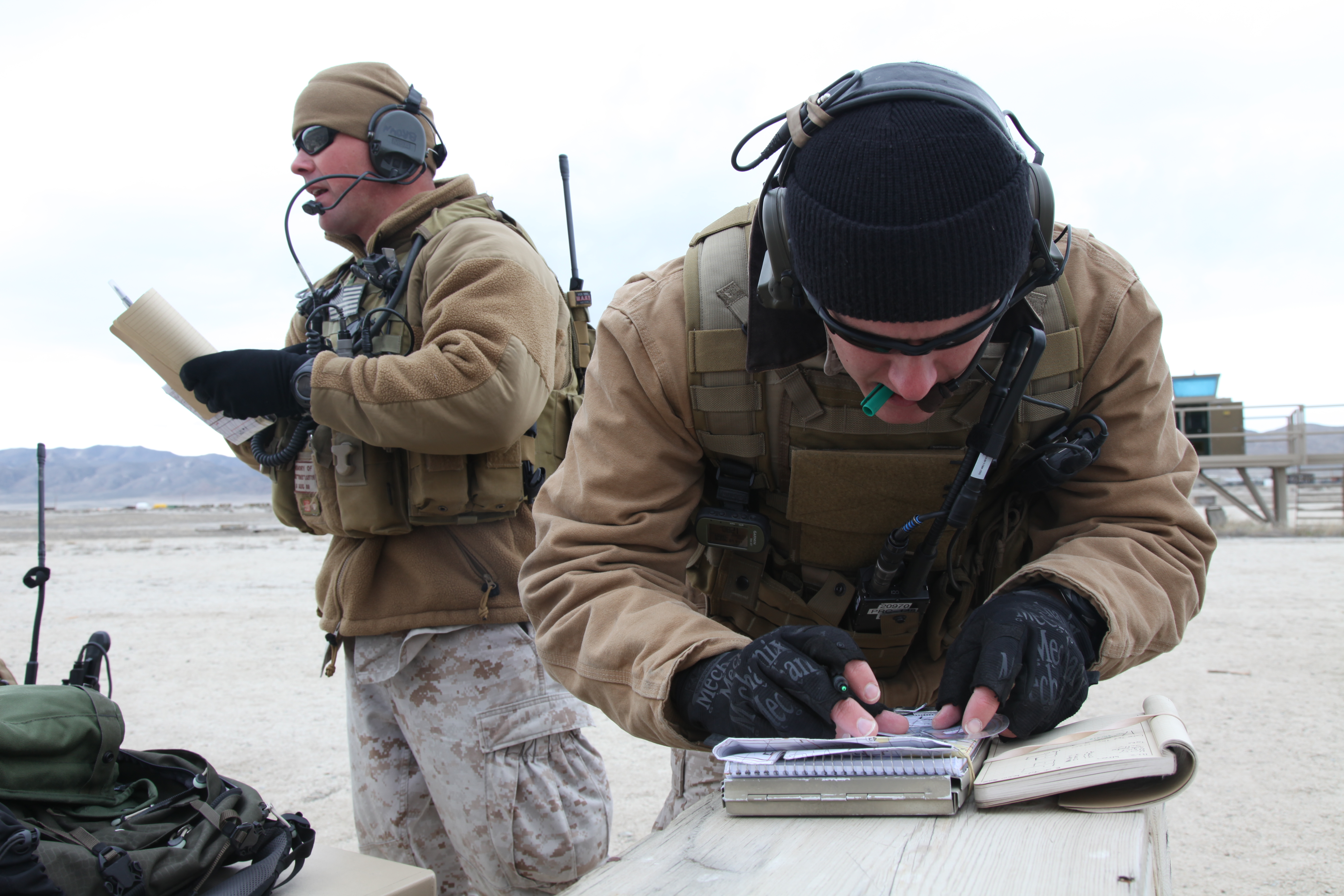 Joint Terminal Attack Controllers with U.S. Marine Corps Forces, Special Operations Command double-check coordinates with aircraft during Carrier Airwing Training conducted by the Naval Strike and Air Warfare Center aboard Naval Air Station Fallon, Nev., April 7. During the exercise, MARSOC JTACs practiced their critical skills and renewed their currencies and qualifications.